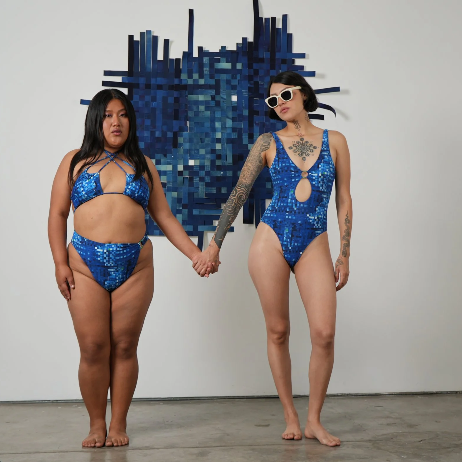 El diseño pasó de la obra material al registro digital, explorando nuevas variaciones cromáticas y multiplicando su potencial expresivo. Finalmente, se trasladó a los trajes de baño, que fueron confeccionados y fotografiados bajo el mismo sol que reveló las cianotipias. Así, la colección BAÑO DE LUZ encuentra coherencia y fuerza: la luz que origina, la luz que viste, la luz que permanece.